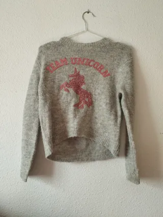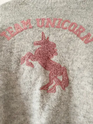 Sudadera de punto gris con un diseño de unicornio. - Unicornio con detalles de glitter. - Texto TEAM UNICORN en la parte superior. - Cuello redondo y manga larga.