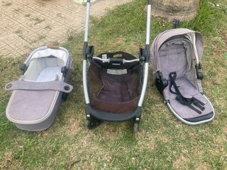 Conjunto de carrito de bebé Maxi-Cosi que incluye capazo y silla. - Capazo con interior acolchado. - Silla de paseo con arnés de seguridad. - Estructura del carrito en color gris.