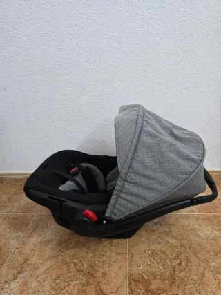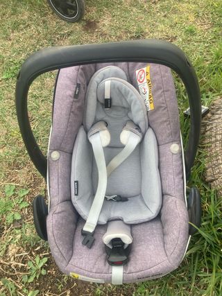 Silla de coche Maxi-Cosi en color gris jaspeado, con sistema i-Size para mayor seguridad. Le falta uno de los acoples al carrito pero sigue valiendo como sillita de coche.