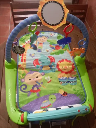 Manta de juegos Fisher Price con piano musical y varios juguetes colgantes. - Piano interactivo con teclas. - Incluye varios muñecos y sonajeros. - Diseño colorido con animales. - Tapete acolchado para mayor comodidad.