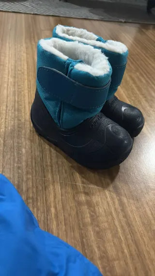 Botas de nieve para bebé de la marca Quechua. Perfectas para mantener los pies calientes en climas fríos. Talla 20/21. - Color azul marino y turquesa. - Interior forrado de pelo sintético blanco. - Cierre de velcro para un ajuste fácil.