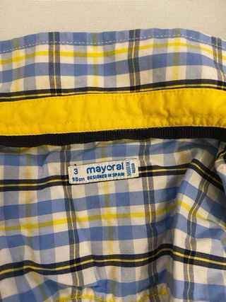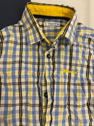 Camisa de cuadros de la marca Mayoral. - Talla 3. - Diseño a cuadros en tonos azules, blancos y amarillos. - Cuello con detalle amarillo. - Logo de Mayoral bordado en amarillo en el pecho.