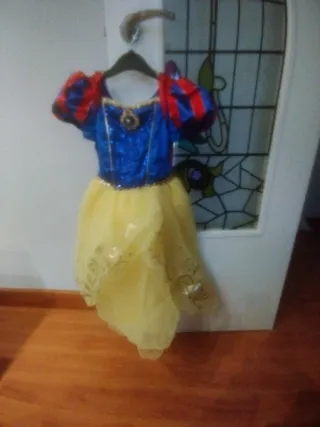 Disfraz de Blancanieves para niña. - Talla 3-4 años. - Cuerpo azul brillante con detalles dorados. - Mangas abullonadas rojas y azules. - Falda amarilla de tul con adornos dorados. Marca Disney