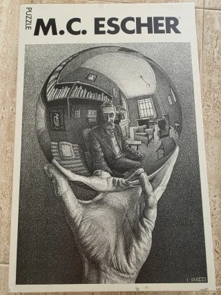 Puzzle de M.C. Escher con la icónica imagen de la mano sosteniendo una esfera reflectante. - Obra de arte surrealista. - Diseño detallado. - Nuevo a estrenar
