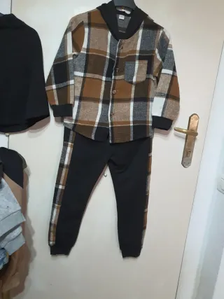 Conjunto de ropa para niño talla 6, ideal para unos 7 años. Incluye camisa y pantalón. - Camisa de cuadros marrones, blancos y negros. - Pantalón negro con detalles de cuadros en los laterales. - Mangas largas y cuello de camisa.