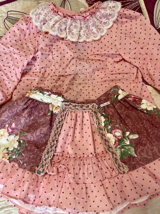 Conjunto de falda y camisa para niña de 3 a 4 años. El tejido de la falda es rosa con topos morados y volantes. La camisa es de color malva con un estampado floral y detalles de encaje. - Falda con volantes. - Camisa con estampado floral.