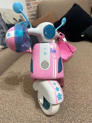 Moto de juguete de la marca Nancy, ideal para coleccionistas o para jugar. - Color rosa con detalles blancos y azules. - Incluye 2 casco a juego. - Cesta delantera. - Decorada con flores.