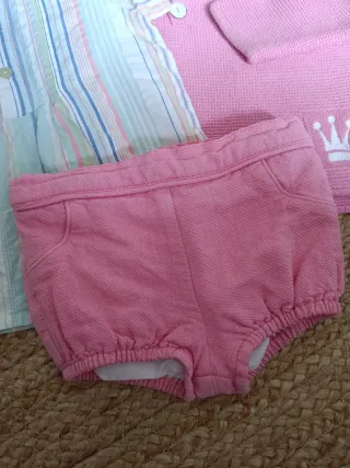 Conjunto de tres piezas de la marca Eva Castro, talla 18. - Camisa a rayas multicolor con cuello mao. - Chaqueta de punto rosa. - Pololo o bombacho rosa.