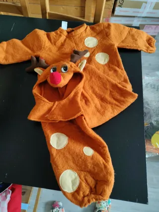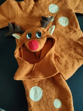 Disfraz de reno para bebé o niño pequeño. - Talla 1/3 años. - Diseño con capucha. - Detalles de ojos y nariz. - Orejas y cuernos. - Aplicaciones redondas.