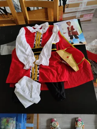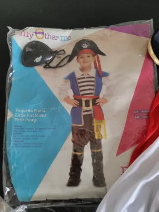 Disfraz de pirata para niño, talla 3-4 años. Incluye sombrero, chaqueta con camisa, cinturón, fajín, pantalones y polainas. - Disfraz temático de pirata. - Incluye múltiples accesorios para un look completo. El cinturón y el parche están un poco desgastados