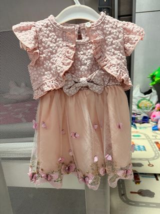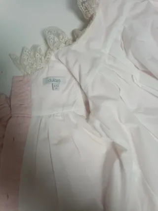 Conjunto de vestido y braguita en color rosa pálido, talla 6-9 meses. - Vestido con cuello de encaje. - Tejido con relieve. - Braguita a juego.