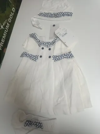 Conjunto de vestido blanco para bebé de la marca Mayoral, talla 1-2 meses. Incluye vestido, capota y braguita. - Vestido con detalles de estampado azul en cuello y mangas. - Cierre con botones. - Braguita a juego con lazo. - Capota a juego con estampado azul.