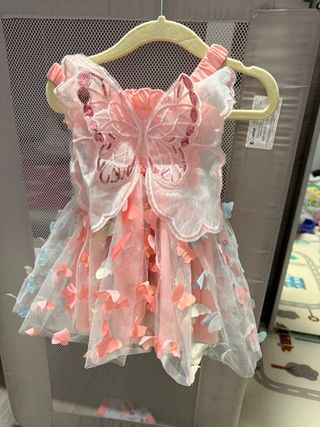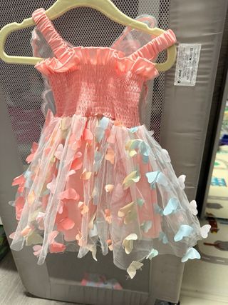 Precioso vestido para niña con un diseño de mariposa. - Color rosa y blanco. - Detalles de mariposas en tul. - Adornado con lentejuelas.