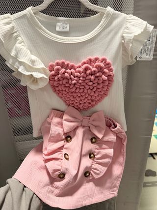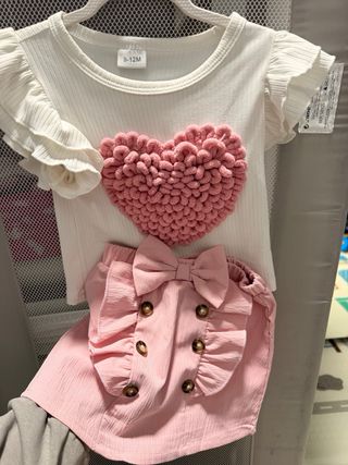 Conjunto de dos piezas para niña, ideal para ocasiones especiales. - Camiseta blanca de manga corta con detalle de corazón texturizado en color rosa. - Falda rosa con volantes, lazo grande y botones decorativos.