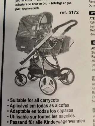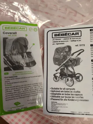 Pack 2 Protector de lluvia original para cochecitos Bebecar. - Modelo Coverall ref. 5126. - Modelo pvc raincover ref. 5172. - Adecuado para todos los capazos y cochecitos. - Fácil de colocar y retirar.