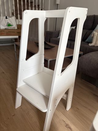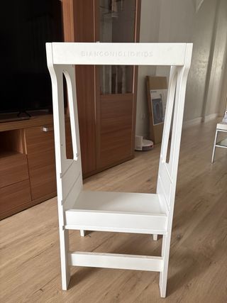 Torre de aprendizaje de madera blanca de Bianconigliokids. Permite a los niños alcanzar superficies elevadas de forma segura. - Estructura de madera. - Tres niveles de altura. - Diseño seguro para niños.
