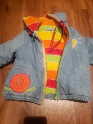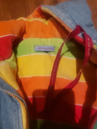 Abrigo infantil de Agatha Ruiz, talla 18 meses. Perfecto para niños o niñas. - Diseño exterior vaquero. - Interior forrado con rayas de colores (naranja, rojo, amarillo, verde). - Detalle de un sol bordado en la parte delantera derecha. - Detalle de un caracol bordado en la parte delantera izquierda.