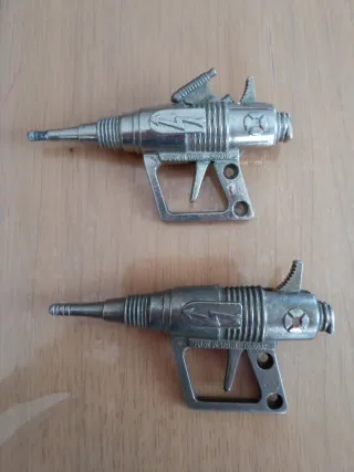 Se vende lote de dos pistolas de juguete. A una de ellas le falta la pieza de arriba.y a las dos las empuñaduras de plástico rojo. Madre in España . De los años 60. - Diseño metálico. - Estilo retro. Hago envíos por wallapop mediante impost. Super bien protegido el paquete.