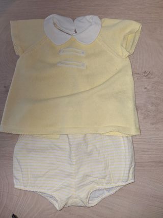 Conjunto de bebé Calamaro, talla 6 meses. Está en buen estado, aunque presenta algunas señales de uso. - Camiseta de manga corta con cuello camisero. - Pantalón a juego. - Ambos en color blanco roto con detalles en celeste. - Confeccionado en tejido suave y ligero.