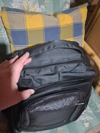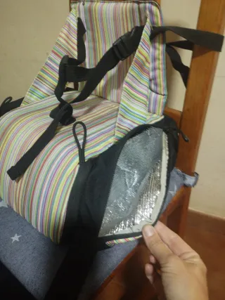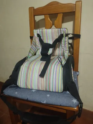 Práctico bolso para convertir una silla normal en trona de viaje. Ideal para llevarlo a cualquier parte. Muy bien cuidado, poco uso. - Negro y rayas multicolor. - Correas de sujeción negras. - Acolchado para mayor comodidad. - Cuatro compartimentos para guardar pañales, juguetes, toallitas, comida.... - Esterilla cambiador para el cambio de pañal.