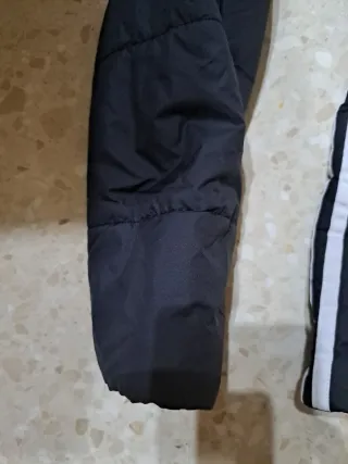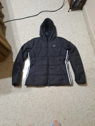 Chaqueta acolchada Adidas en color negro, ideal para el frío. - Diseño con capucha. - Detalles de las tres rayas blancas en las mangas. - Logo de Adidas en el pecho.