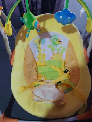 Mecedora musical para bebés con un diseño alegre y colorido. - Estructura resistente con soportes laterales. - Asiento acolchado y seguro. - Barra de juegos con peluches. - Arnés de sujeción.