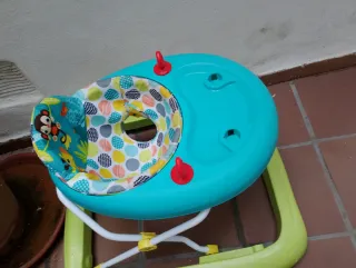 Andador para bebés con un divertido diseño. - Asiento acolchado con estampado de animales. - Base de plástico resistente en color verde y azul. - Ruedas giratorias para facilitar el movimiento.