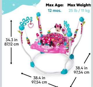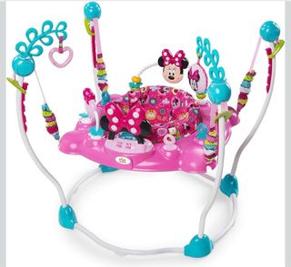 Centro de actividades y saltador con temática de Minnie Mouse. Ideal para el entretenimiento del bebé. - Diseño en color rosa. - Incluye varios juguetes colgantes. - Asiento acolchado y giratorio. - Sonido y luces.