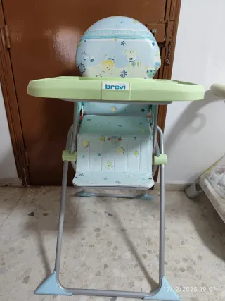 Trona plegable de la marca Brevi, ideal para las comidas de los más pequeños. Su diseño es ligero y fácil de almacenar. - Estructura metálica. - Asiento acolchado con estampado infantil. - Bandeja extraíble. - tiene algunos arañazos del desgaste pero cumple todas sus funciones