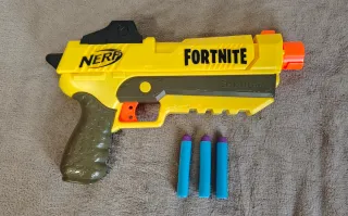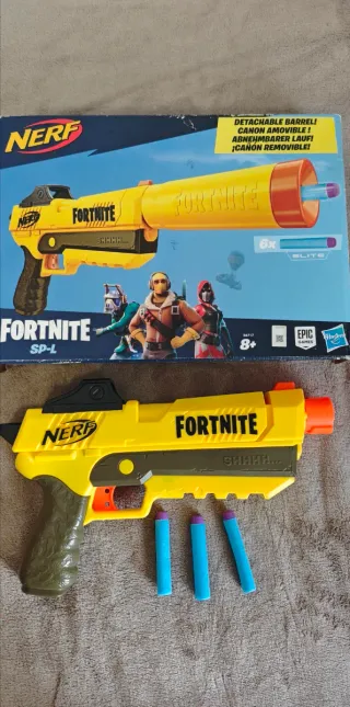 Pistola de juguete Nerf Fortnite SP-L, inspirada en el popular videojuego. - Nueva , sin uso. - Caja algo deteriorada - Diseño amarillo y verde característico. - Incluye 3 dardos de espuma azules con punta morada. - Cañón desmontable.