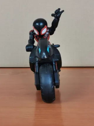 Figura de Spider-Man con su moto. - Figura de acción de Spider-Man. - Moto negra con detalles rojos y azules.