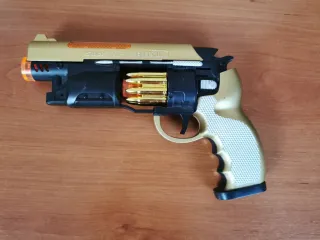 Pistola de juguete con un diseño llamativo en color dorado y negro. Incluye un tambor giratorio con balas simuladas. - Tambor con capacidad para varias balas. - Detalles en color dorado y negro.
