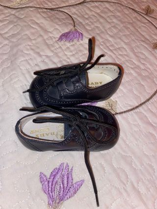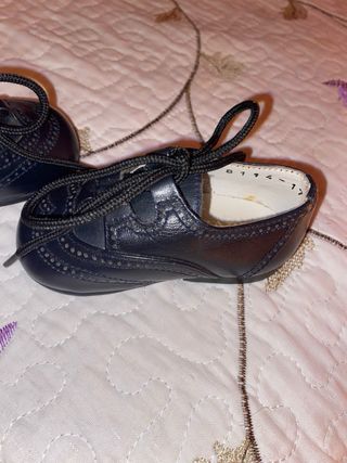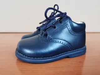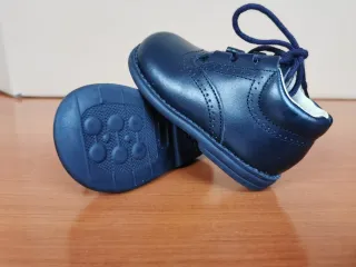 Preciosos zapatos de vestir para bebé. - Color azul marino. - Talla 17. - Cierre con cordones. - Detalle de picado en los bordes.