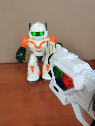 Set de juguete de robot con accesorios. - Robot de color blanco y naranja. - Incluye una pistola blanca. - Viene con un escudo. - Brazos y piernas articulados.Tiene sonidos y luces y también anda y gira, la pistola tiene luces y sonidos
