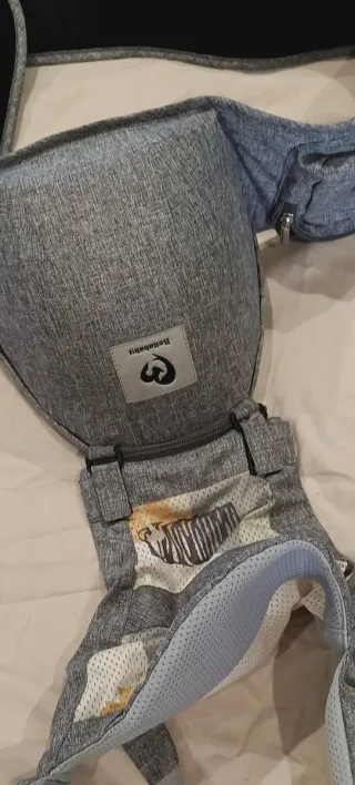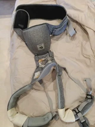 Portabebés ergonómico en color gris, diseñado para la comodidad. - Cinturón lumbar acolchado. - Tirantes ajustables y acolchados. - Tejido transpirable.