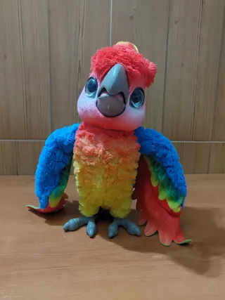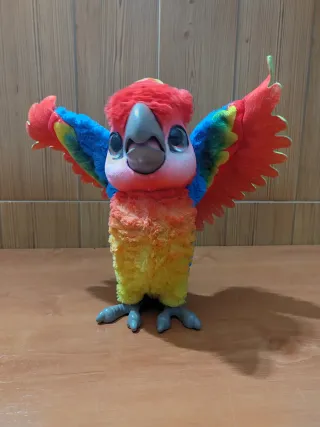 Este loro de peluche, Lolo, es muy colorido y suave. Tiene un diseño divertido y llamativo. - Peluche con forma de loro. - Colores vibrantes: rojo, naranja, amarillo y azul. - Textura suave y esponjosa.Habla, cuenta chiste mueve las alas y la cresta