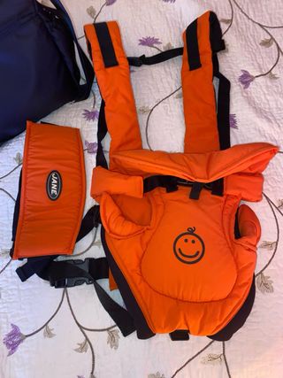 Portabebés de la marca Jane en color naranja. Incluye un accesorio acolchado. - Diseño con cara sonriente. - Marca Jane visible en el accesorio.