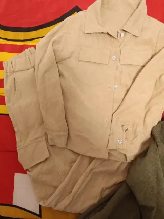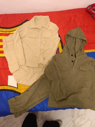Conjunto de dos piezas para niño de la marca Shein. Ideal para un look casual. - Camisa de manga larga en color beige con botones. - Pantalón a juego en color beige. - Sudadera con capucha en color verde militar. - Bolsillos en la sudadera. Como de panita fina Talla 7