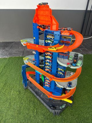 Torre de garaje Hot Wheels Ultimate con múltiples niveles y rampas. - Incluye un dinosaurio verde. - Base negra con detalles de pista. - Varios coches pequeños incluidos. PRECIO ORIGINAL 159€