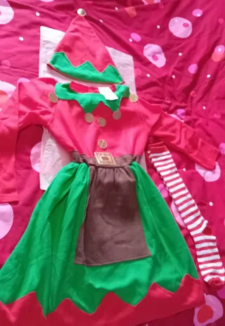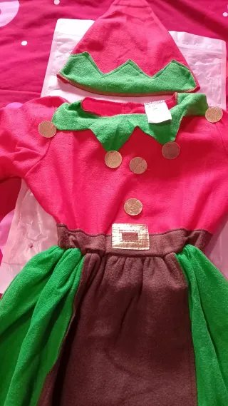 Disfraz de elfo para niña😍 👧 ideal para fiestas temáticas o Navidad. Incluye gorro y calcetines. - Gorro de elfo rojo con detalles verdes. - Vestido rojo con falda verde y cinturón marrón. - Detalle de cascabeles dorados en el cuello. - Calcetines a rayas rojas y blancas. Usado unos minutos de actuación,como nuevo.