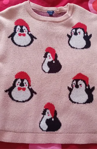 Jersey de punto para niña con estampado de pingüinos. - Diseño divertido con pingüinos. - Manga larga. - Cuello redondo. Para talla 12 años,no es muy grande puede servir de 10 a 12 años