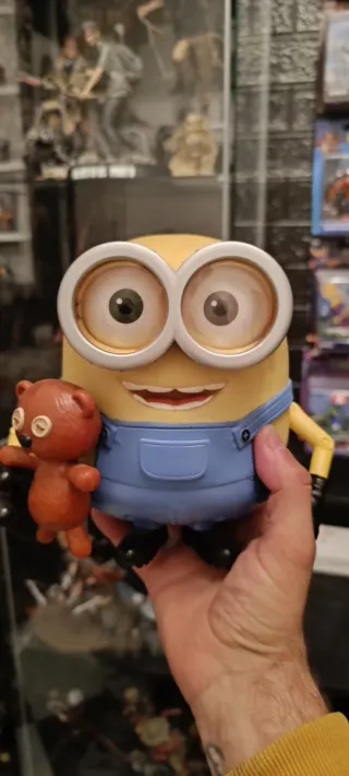 Figura del personaje Bob de los Minions. Figura interactiva dice frases y hace sonidos si le aprietas en la cabeza o la barriga - Personaje de la película. - Incluye un pequeño oso de peluche.