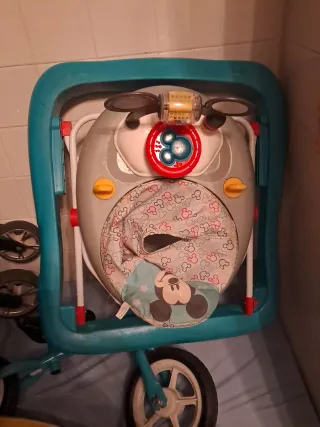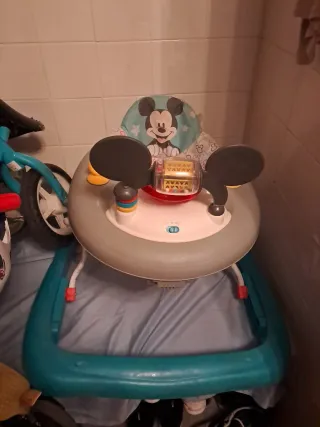 Andador para bebés con diseño de Mickey Mouse. Ideal para que los más pequeños exploren. - Estructura de plástico resistente. - Asiento acolchado con estampado de Mickey. - Bandeja de juegos con elementos interactivos con sonidos y luces. - Ruedas para facilitar el movimiento.