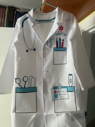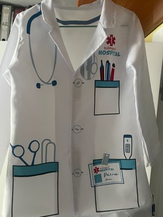 Disfraz de bata de doctor para niños, ideal para juegos de rol y fiestas. - Bata blanca con estampado de accesorios médicos. - Incluye estetoscopio, tijeras, termómetro y bolígrafos. - Diseño divertido con bolsillos. - Marca: ItsImagical Hospital.