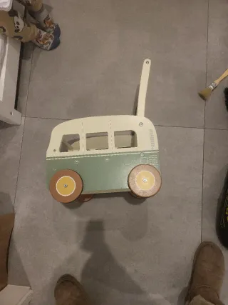 Este carrito de madera es perfecto para los más pequeños. - Diseño inspirado en una furgoneta. - Ruedas de madera. - Asa para empujar. - Detalles en verde y beige.