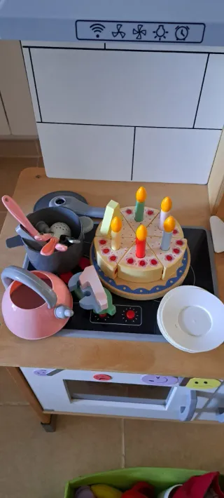 Divertida cocina de juguete de madera, ideal para horas de juego. - Incluye accesorios como tetera, platos, cubiertos y comida de juguete. - Decorada con pegatinas de caras sonrientes y otros motivos. - Cuenta con horno, microondas y fregadero.