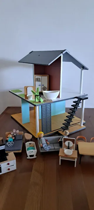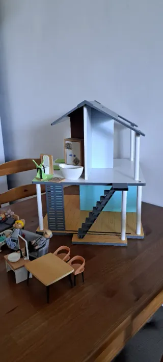 Casa de muñecas de madera con varios accesorios y muebles. - Estructura de madera. - Incluye muebles de baño, sala y cocina. - Escalera de acceso.