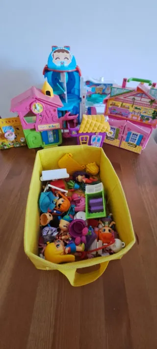 Conjunto de muñecas y casas de juguete Pinipons. - Incluye varias figuras de muñecas. - Varias casas de juguete con accesorios. - Un coche de juguete. - Accesorios adicionales como árboles y animales.