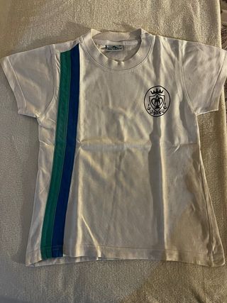Camiseta deportiva blanca para el Colegio Pureza de María. - Talla 6. - Diseño con franjas verticales azul y verde en el lateral izquierdo. - Escudo del colegio en la parte delantera derecha. - Con signos de uso Dispongo de 2 unidades