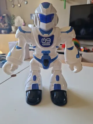 Divertido robot de juguete con un diseño futurista en blanco y azul. - Detalles en color azul brillante. - Diseño con el número 09 y la palabra Robot en el pecho. - Base de los pies en color negro.
